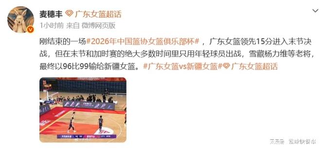 WCBA俱乐部决赛阶段小组赛正式打响,女篮联赛新霸主广东队迎战新疆队。尽管广东队缺少了杨舒予、陈明伶等主力球员,不过,在这一场比赛,广东队大部分时间里还是能够压制住对手。可在末节比赛,广东队却突然断电,在一度手握15分领先优势的情况下,竟然被新疆队神奇逆转。虽然广东队最后时刻命中超远三分扳平比分。可在随后的加时赛,广东队还是未能顶住压力,最终以96-99不敌新疆队,遭遇首败。